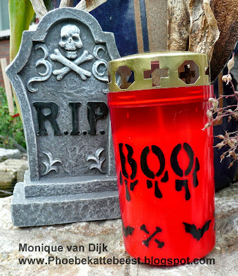 a little quick project, a grave light which I decorated using a glass paint marker and a Deco Art Stencil called Spooky, added some green Rhinestones to the skulls eyes.